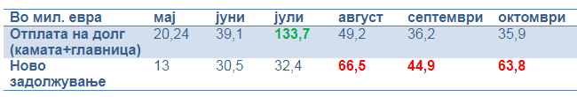 Најголема месечна камата за домашен долг е платена токму во октомври и таа изнесува 332 милиони денари односно околу 5,5 милиони евра.