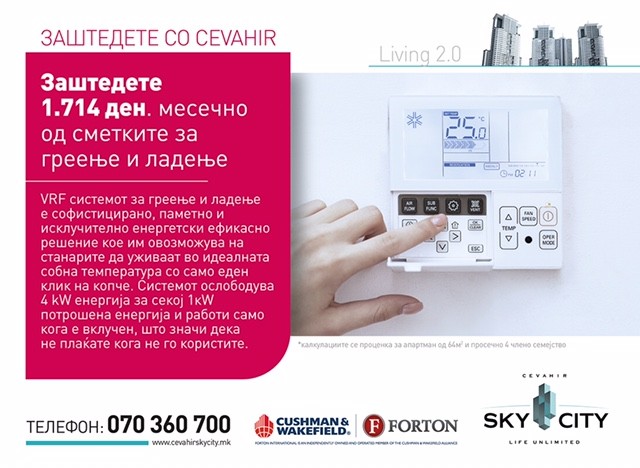 Ако во моментов имате околу 60 метри квадратен стан, во Скај Сити за истата квадратура ќе заштедите околу 1700 денари месечно на сметките за греење и ладење. Нема да морате да го вклучуватебојлерот бидејќи имате на располагање топла вода во секое време, а годишно за оваа намена ќе заштедувате околу 110 евра. Заштедите во финансиски средства доаѓа како податок плус на веќе постоечките придобивки за секој станар во комплексот на Скај Сити.