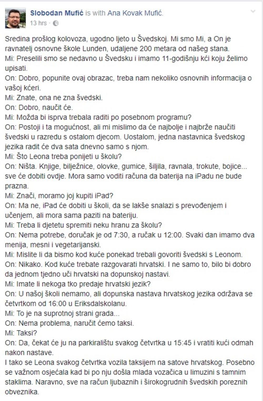 Тој на Фејсбук раскажува дека кога отишол да ја запише во училиште својата 11 годишна ќерка, се зачудил дека како родител не треба да купува ништо, и дека тетратки, учебници, пенкала, ќе добие од училиштето, а на прашањето дека неговото дете не зборува шведски, добил одговор дека ќе научи.