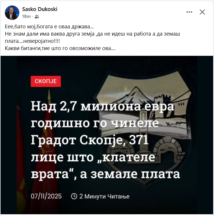 И адвокатот Сашо Дуковски со реакција за вработените во Комунална хигиена, кои земале плата а не оделе на работа.