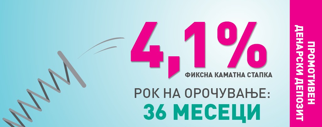 Стопанска банка а.д. Битола со најконкурентна депозитна понуда на пазарот. Промотивниот денарски депозит со фиксна каматна стапка 4,1% за орочување на средства на период од 36 месеци е моментално најатрактивен производ кој може да го изберат сите постоечки и нови клиенти на Банката.