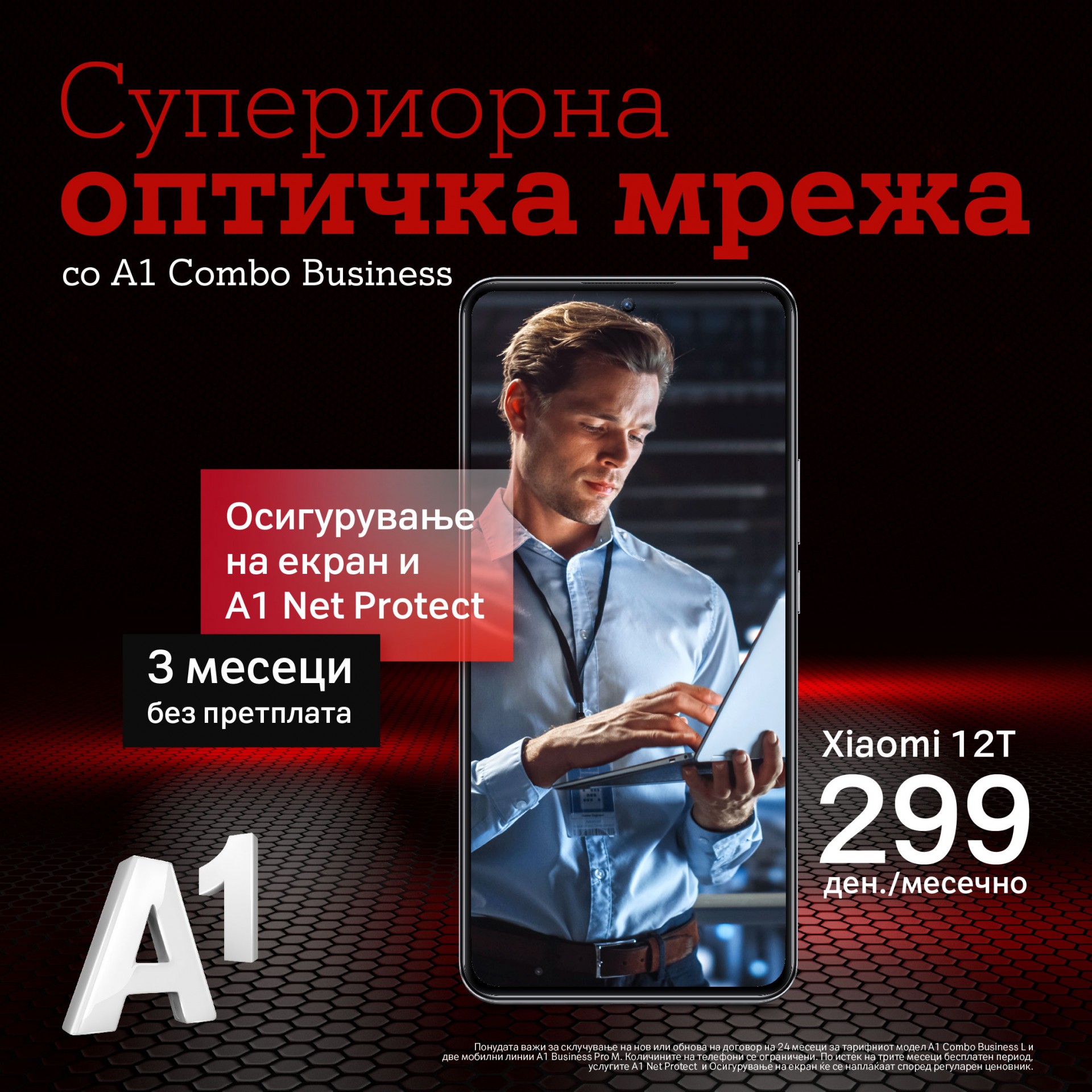 Со комбинирање на мобилните и фиксните услуги во А1 Combo Business пакетот, корисниците добиваат брз и стабилен интернет преку супериорна оптичка мрежа за својата канцеларија како и дополнителни поволности во облик науште поголеми попусти и поголеми буџети за набавка на уреди. За уште поголема безгрижност и дополнителна безбедност при користење на мобилните услуги на најбрзата мобилна мрежа, за нова активација или обнова на Mobile Business Pro портфолиото, А1 нуди и три месеци бесплатно осигурување на екранот за избраниот телефон и тримесеци бесплатно користење на A1 Net Protect