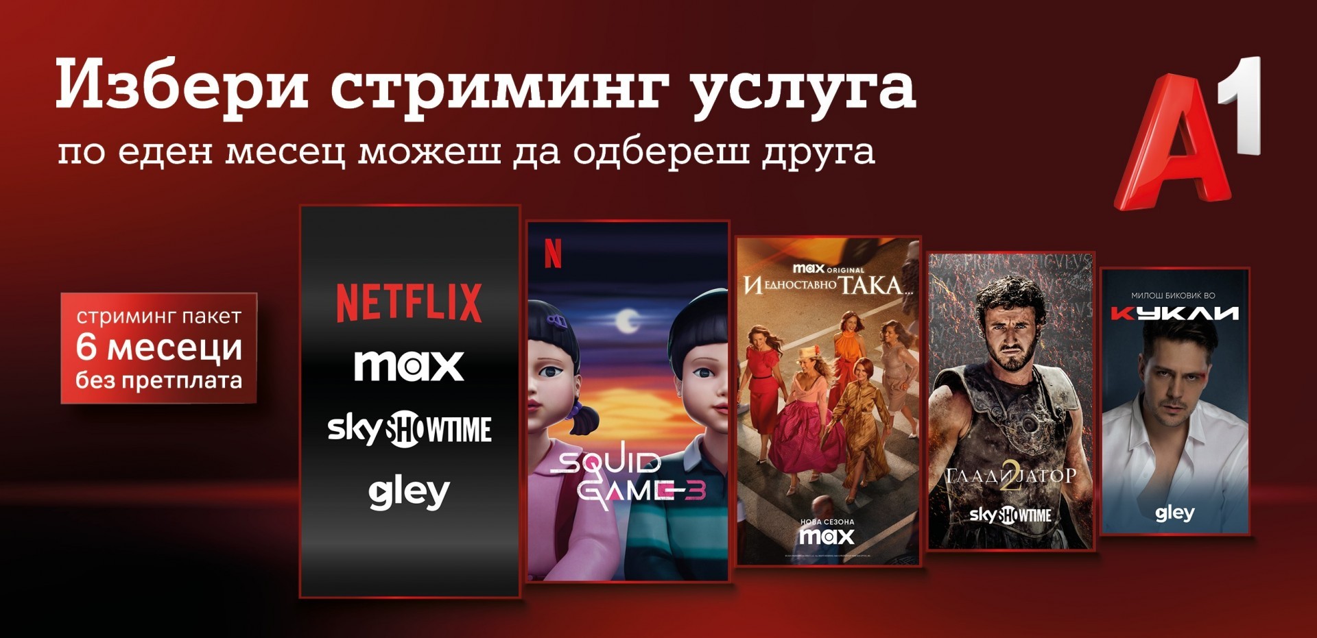 А1 Македонија ја претставува својата најнова и уникатна стриминг понуда која овозможува пристап до четири водечки стриминг платформи – Netflix, Max, SkyShowtime и Gley – сите во еден пакет. Корисниците добиваат можност секој месец да изберат една стриминг услуга која сакаат да ја гледаат, со можност да ја заменат со друга по истекот на 30 дена. Оваа флексибилност им овозможува на корисниците сами да ја креираат својата филмска забава, според сопствените интереси и расположение.