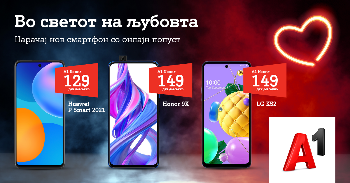 Корисниците можат да изберат од новата листа на смарт телефони достапни со промотивен онлајн попуст и тоа, Huawei P Smart 2021 за месечна рата од 129 денари, Honor 9X или LGK52 за месечна рата од 149 денари, како и Huawei P40 lite за месечна рата од 239 денари, само со тарифниот модел А1 Neon+.