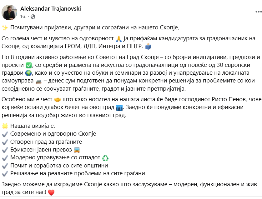 Александар Трајановски на Фејсбук објави дека ја прифаќа кандидатурата за градоначалник на Скопје, од коалицијата ГРОМ, ЛДП, Интегра и ПЦЕР.