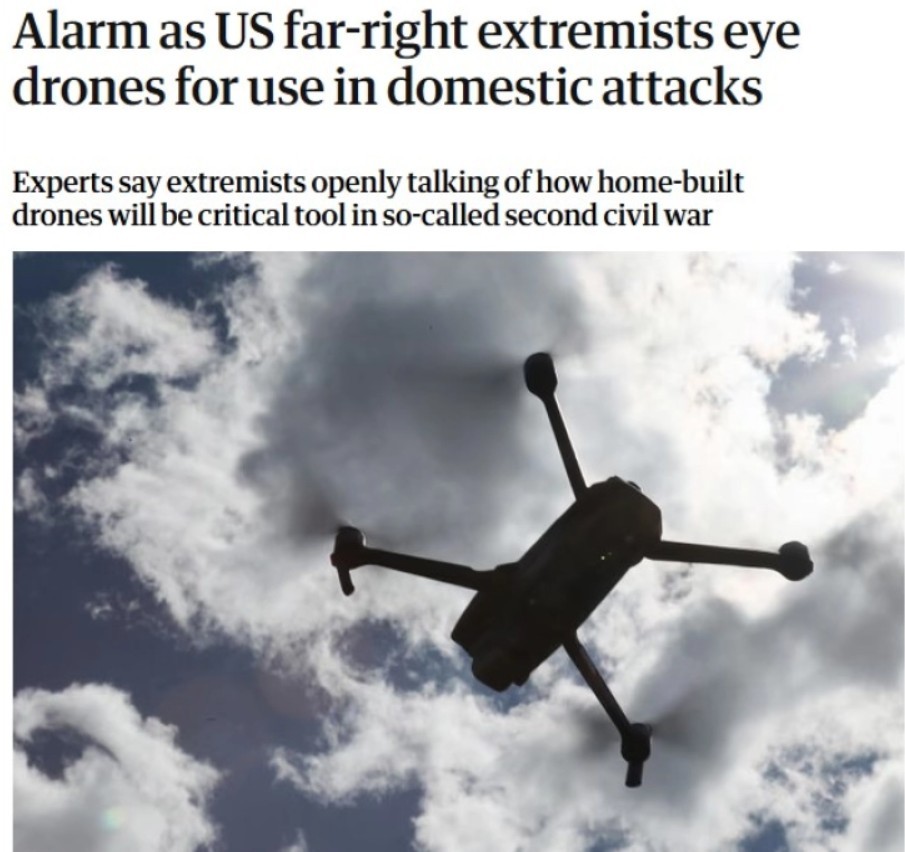 Американски крајнодесничарски екстремисти отворено разговараат за употреба на своерачно изработени дронови како стратешко оружје во потенцијална „втора граѓанска војна“ против владата на САД, објави британскиот весник „Гардијан“.