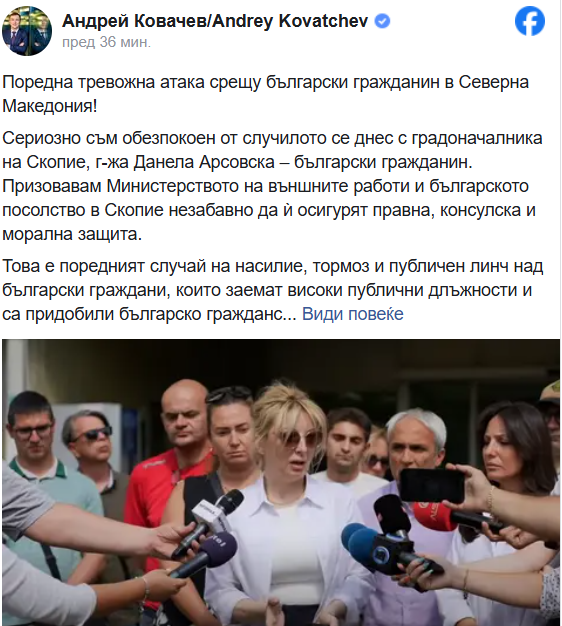 „Уште еден вознемирувачки напад врз бугарски државјанин во Северна Македонија! Сериозно сум загрижен од она што се случи денес со градоначалничката на градоначалничката на град Скопје, Данела Арсовска - бугарска државјанка. Ги повикувам Министерството за надворешни работи и бугарската амбасада во Скопјe веднаш да ѝ обезбедат правна, конзуларна и морална заштита“, пишува Андреј Ковачев на социјалните мрежи.