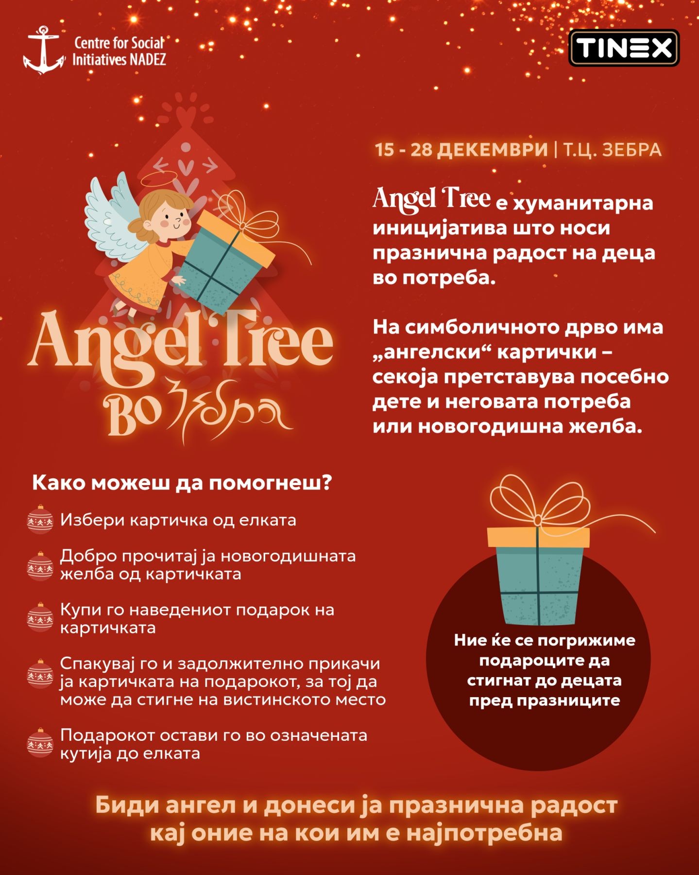 Од 15 до 28 декември, во Тинекс Зебра, се реализира хуманитарната иницијатива Angel Tree, која има за цел да ги исполни новогодишните желби на деца од социјално загрозени семејства. Преку избор на „ангелска“ картичка и донирање подарок, граѓаните можат директно да придонесат кон создавање празнична радост и топлина за најмладите.