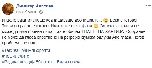 Професорот Димитар Апасиев од Левица на неговиот Фејсбук профил напиша дека одлуката за пристапување кон менување на Уставот нема и не може да има правна сила.