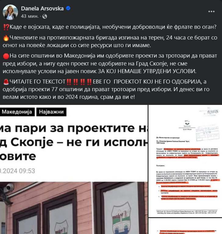 „Каде е војската, каде е полицијата, необучени доброволци ќе фрлате во оган Членовите на противпожарната бригада изгинаа на терен, 24 часа се борат со огнот на повеќе локации со сите ресурси што ги имаме. На сите општини во Македонија им одобривте проекти за тротоари да прават пред избори, а ниту еден проект не одобривте на Град Скопје, не сме исполнувале услови на јавен повик ЗА КОЈ НЕМАШЕ УТВРДЕНИ УСЛОВИ. ЧИТАЈТЕ ГО ТЕКСТОТ![]()