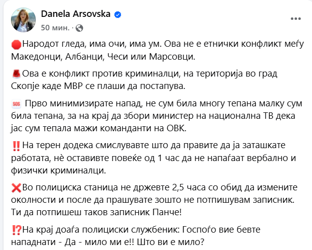 Градоначалничката на Град Скопје, Данела Арсовска, преку два последователни статуси на Фејсбук упати критики до полицијата и лично до министерот Панче Тошковски, за нападот кој деновиве го доживеа таа во Чаир.