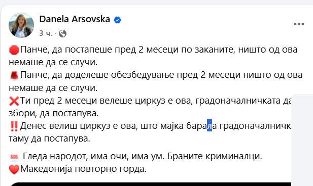 „Панче, да постапеше пред 2 месеци по заканите, ништо од ова немаше да се случи. Панче, да доделеше обезбедување пред 2 месеци ништо од ова немаше да се случи“, пишува Арсовска.