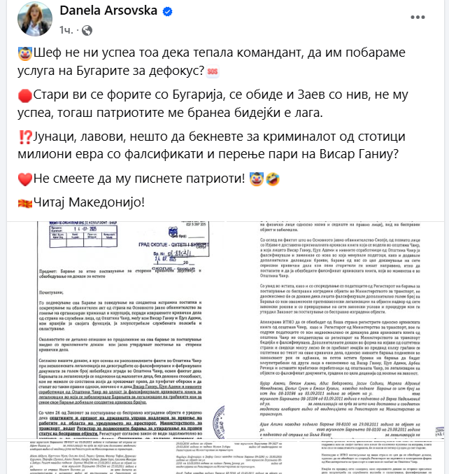 „Шеф не ни успеа тоа дека тепала командант, да им побараме услуга на Бугарите за дефокус? Стари ви се форите со Бугарија, се обиде и Заев со нив, не му успеа, тогаш патриотите ме бранеа бидејќи е лага. Јунаци, лавови, нешто да бекневте за криминалот од стотици милиони евра со фалсификати и перење пари на Висар Ганиу? Не смеете да му писнете патриоти! Читај Македонијо!“, напиша Арсовска.