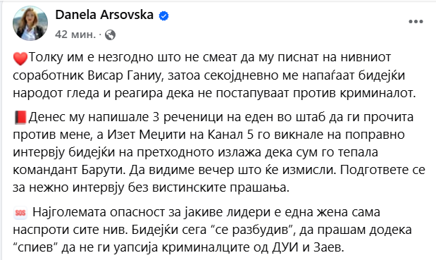 Градоначалничката на Град Скопје, Данела Арсовска денеска повторно обвини дека власта не смее да му писне на Висар Ганиу од Чаир, а само неа ја напаѓаат.