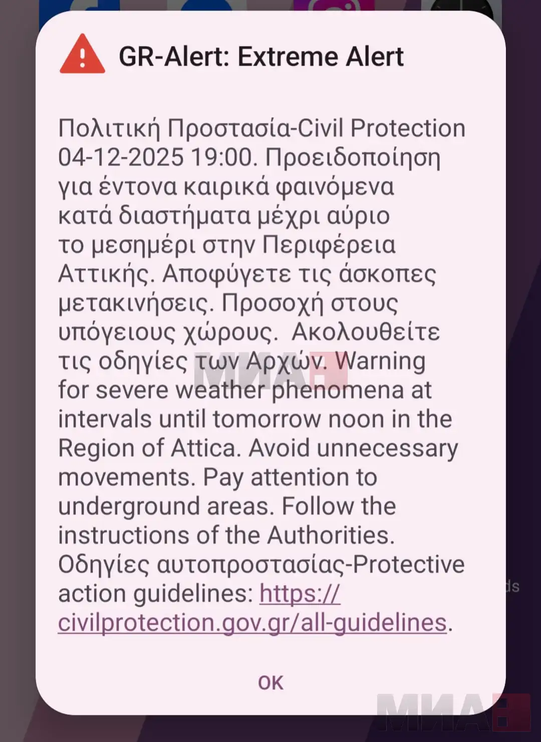 Пораки од 112 со предупредување за невремето и апел да избегнуваат непотребни движења добија и сите оние кои се во делови на Пелопонез, во северна и централна Грција, во областа Атија, на островите Евија, Хиос, Самос, Икарија, Крит, како и на Додеканез и Кикладските острови.