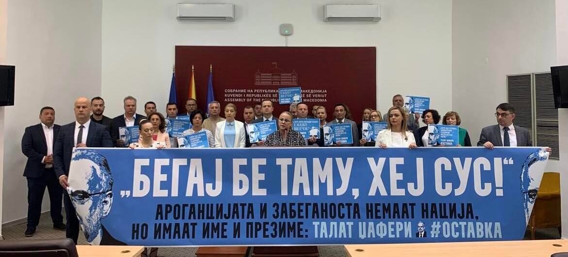 Пратеничката група на ВМРО-ДПМНЕ денеска со изложени транспаренти во прес салата на Законодавниот дом побара оставка од претседателот на Собранието, Талат Џафери, по објавената аудио-снимка по 71.седница за која се тврди дека се слуша гласот на спикерот како ги пцуе и навредува вработените од службите.