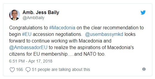 Амбасадорот на САД во земјава, Џес Бејли, на „Твитер“ упати честитка до Република Македонија за чистата препорака за почеток на преговорите со ЕУ.