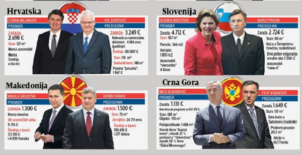 Претседателот на Хрватска Иво Јосиповиќ заработува скоро три пати повеќе од Николиќ 3249 евра, има стан, канцеларија, заштеда во банка од 300.000 евра. Црногорскиот претседател Филип Вујановиќ има стан од 157 квадрати, дел од куќа во Суто Море и скромен раборен простор од околу 30 квадрати.