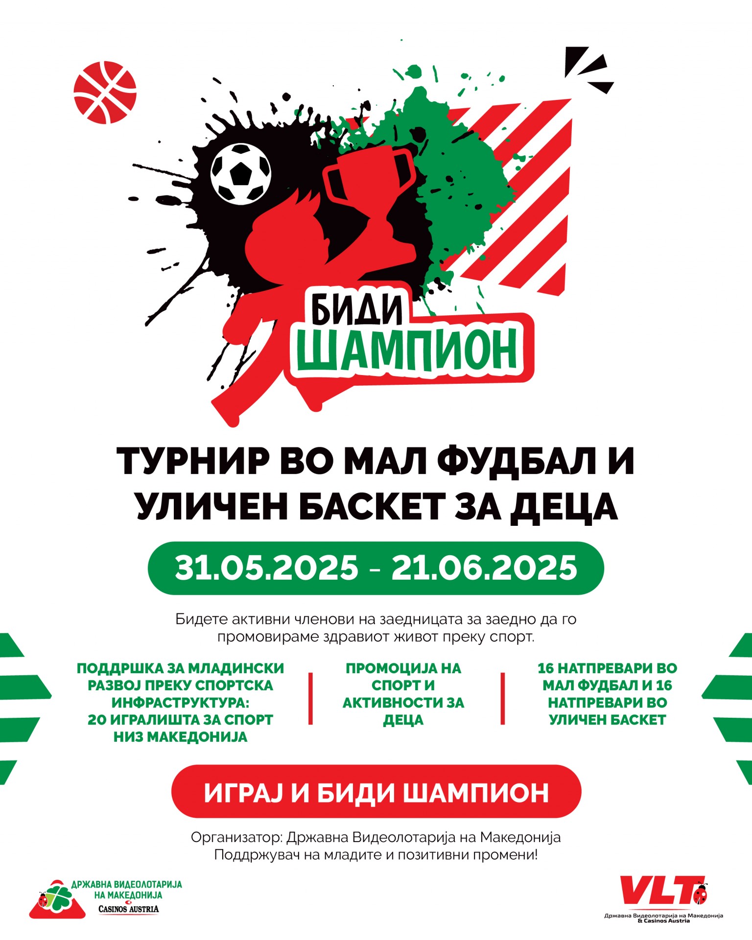 Видеолотарија Касинос Австрија го организира турнирот БИДИ ШАМПИОН, кој трае до 28 јуни. Со 16 натпревари во мал фудбал и 16 натпревари во уличен баскет за деца од 10 до 14 години, ќе се обидеме да придонесеме за промоција на спортот, фер игра, тимскиот дух и спортските вредности меѓу младите