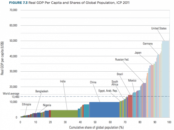 Поголемиот дел од светот, околу 70% се наоѓаат под глобалниот просек ( бидејки богатите земји го влечат просекот нагоре) и е стрмен чекор нагоре: САД го сочинуваат поголемиот дел од богатството во светот, со БДП по глава на жител со само “срамежливи” 50.000 американски долари што е за скоро четири пати повеќе од глобалниот просек.