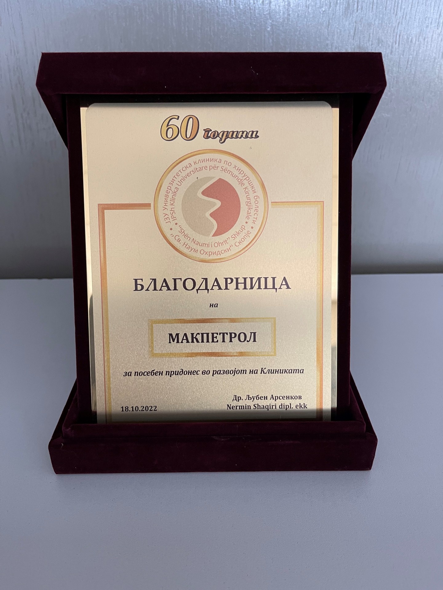 Токму затоа, ни претставува огромно задоволство и чест што на вчерашната свечена академија, по повод 60-ти годишен јубилеј на Универзитетската клиника за хируршки болести „Св. Наум Охридски“, на компанијата „Макпетрол“ АД ѝ беше врачена благодарница за посебен придонес во развој на клиниката.