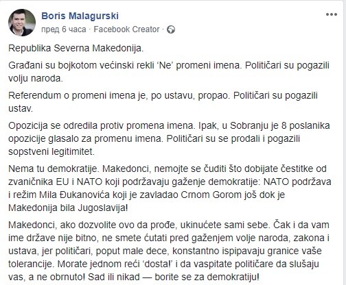 „Политичарите се продадоа и го погазија сопствениот легитимитет. Нема тука демократија. Македонци немојте да се чудите што добивате честитки од челници на ЕУ и НАТО: НАТО го поддржува и режимот на Мило Џукановиќ кој завладеа со Црна Гора уште кога Македонија беше Југославија. Македонци ако дозволите ова да помине, ќе се укинете сами себе. Дури и ако името на државата не ви е важно, не смеете да молчите пред волјата на народот, закон и Устав, затоа што политичарите како мали деца постојано ги испитуваат границите на вашаат толеранција“, пишува Малагурски на Фејсбук.