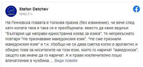 „Не може цела Бугарија да се срами поради одлуката на еден секција на Бугарската академија на науките (БАН) или на едно семејство лингвисти. Во Брисел, во Париз, во Берлин, во Амстердам, во Копенхаген, во Токио, во Вашингтон, во Москва, во Киев, во министерствата за надворешни работи, на универзитети и катедри, јазикот е македонски. И тука падежите, инфинитивите, клаузулите, акцентите и т.н. воопшто не се важни“, пишува тој во својот коментар.