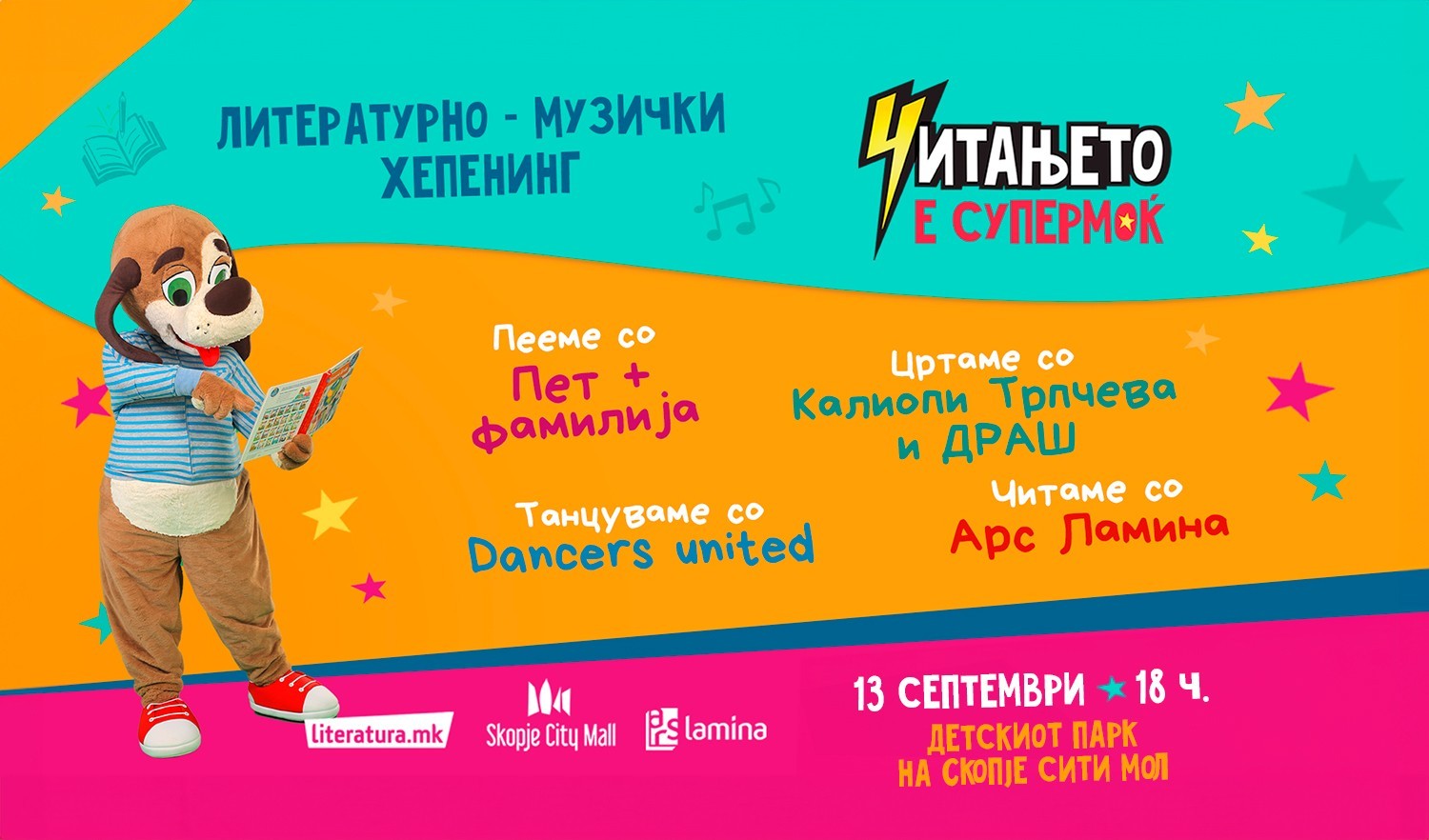 За среќен и успешен почеток на новата учебна година, на 13 септември (сабота), со почеток во 18 часот, во детскиот парк на „Скопје сити мол“ ќе се одржи литературно-музичкиот хепенинг „Читањето е супермоќ“.