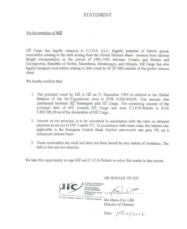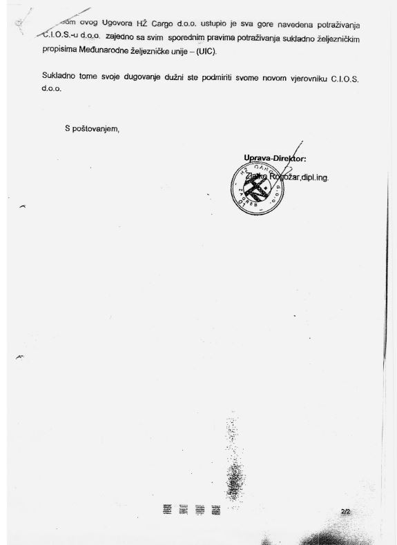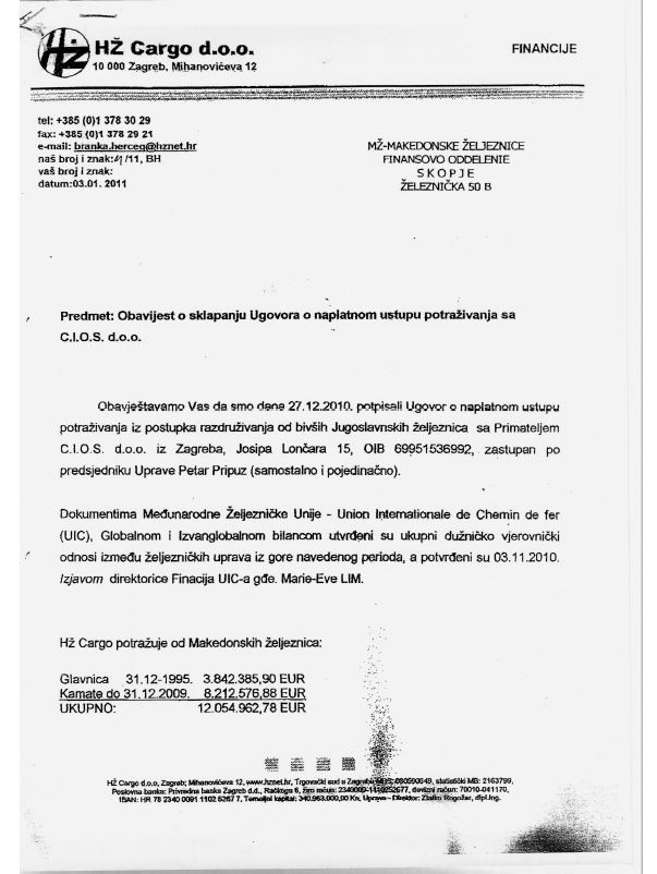 Во 2010 година, нашата компанија „ЦИОС – група“ на меѓународен јавен тендер ги откупи сите побарувања на „ХЖ Карго“ кон железничките компании од Западен Балкан (Србија, Црна Гора, Македонија, БиХ и Албанија), во вкупен износ од 44.679.978,18 милиони евра. Како „ЦИОС – група“ успешно постигнавме спогодбено порамнување со сите земји освен со Македонија, каде што останува нејасно зошто институциите со години не одговараат на нашите повици за договор.
