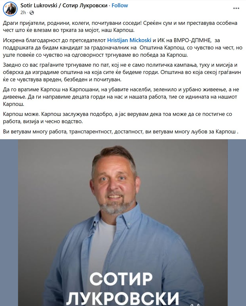- Искрена благодарност до претседателот Hristijan Mickoski и ИК на ВМРО-ДПМНЕ, за поддршката да бидам кандидат за градоначалник на Општина Карпош, со чувство на чест, но уште повеќе со чувство на одговорност тргнуваме во победа за Карпош.