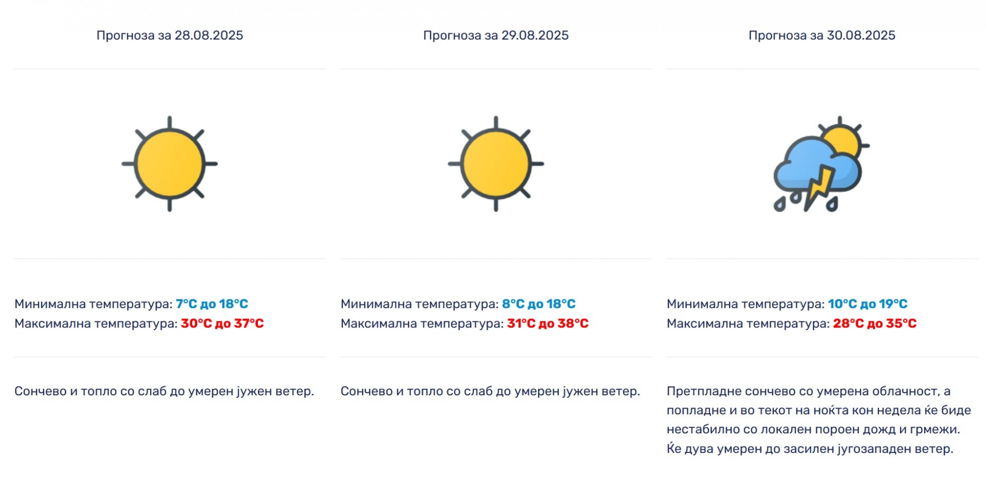 Утринските температури ќе се движат од 6 до 17 степени, додека дневните од 27 до 35 степени.