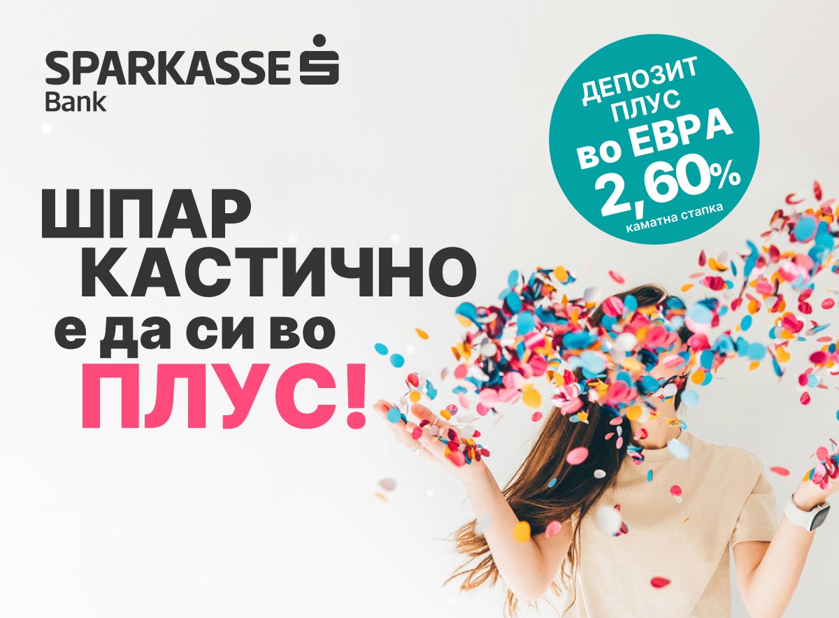 Шпаркасе Банка АД Скопје ги информира своите клиенти и јавноста дека денеска започнува нова промотивна понуда за штеден производ – „Депозит плус“, достапен во евра и со зголемена и загарантирана каматна стапка за целиот период на орочување.
