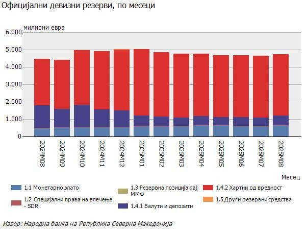 На крајот на август 2025 година, официјалните девизни резерви изнесуваат 4.754,4 милиони евра и во однос на претходниот месец бележат зголемување за 84,5 милиони евра, соопшти Народната банка.