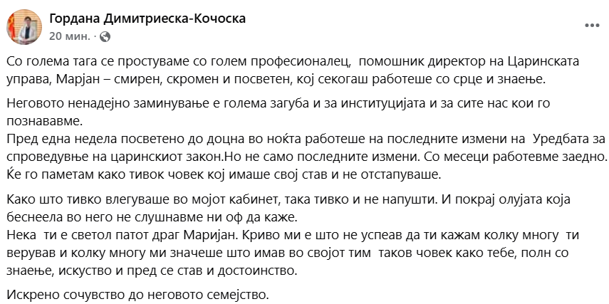 Министерката за финансии Гордана Димитриеска-Кочоска на социјалните мрежи објави дека починал помошник директор на Царинската управа, Марјан Тасевски. Го опишува како скромен и посветен.