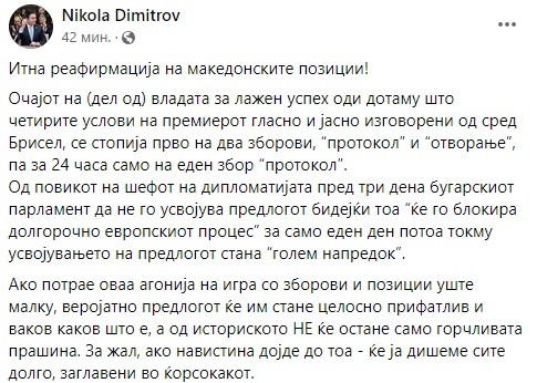 „Од повикот на шефот на дипломатијата пред три дена бугарскиот парламент да не го усвојува предлогот бидејќи тоа „ќе го блокира долгорочно европскиот процес” за само еден ден потоа токму усвојувањето на предлогот стана „голем напредок”. Ако потрае оваа агонија на игра со зборови и позиции уште малку, веројатно предлогот ќе им стане целосно прифатлив и ваков каков што е, а од историското НЕ ќе остане само горчливата прашина. За жал, ако навистина дојде до тоа - ќе ја дишеме сите долго, заглавени во ќорсокакот. Затоа најитно е потребна гласна реафирмација на македонските позиции и дома и надвор, за да ги чујат сите кои можеби не сакале да ги слушнат, вклучувајќи го и еврокомесарот Вархеји. Во вакви услови, кога јавноста е оставена да се храни само со полуинформации, како очекувате да нема грижи и дилеми? Абе за НАС се работи, за секој од нас. Има да одговарате на секое ново прашање, а не уште да обвинувате“, пишува Димитров на социјалните мрежи.
