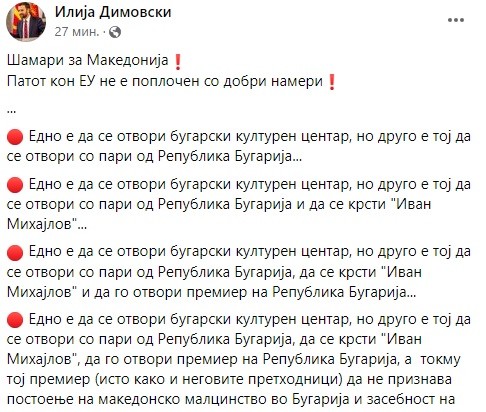„Едно е да се отвори бугарски културен центар, но друго е тој да се отвори со пари од Република Бугарија и да се крсти "Иван Михајлов"... Едно е да се отвори бугарски културен центар, но друго е тој да се отвори со пари од Република Бугарија, да се крсти "Иван Михајлов" и да го отвори премиер на Република Бугарија... Едно е да се отвори бугарски културен центар, но друго е тој да се отвори со пари од Република Бугарија, да се крсти "Иван Михајлов", да го отвори премиер на Република Бугарија, а токму тој премиер (исто како и неговите претходници) да не признава постоење на македонско малцинство во Бугарија и засебност на македонскиот народ низ вековите наназад... ...Едно е да се отвори бугарски културен центар, но друго е тој да се отвори со пари од Република Бугарија, да се крсти "Иван Михајлов", да го отвори премиер на Република Бугарија кој (исто како и неговите претходници) не признава постоење на македонско малцинство во Бугарија и засебност на македонскиот народ низ вековите наназад, а токму тој премиер и неговата Влада да не дозволат преговори за членство на Република Македонија во ЕУ под изговор за непочитување на малцински и човекови права...“, пишува Димовски. Инаку, Бугарија до јуни нема да го тргне ветото за Македонија и нагласија дека дотогаш Македонија не може да го отвори Уставот и да ги внесе Бугарите. Соседна Албанија се изјасни дека ќе бара раздвојување од Македонија.