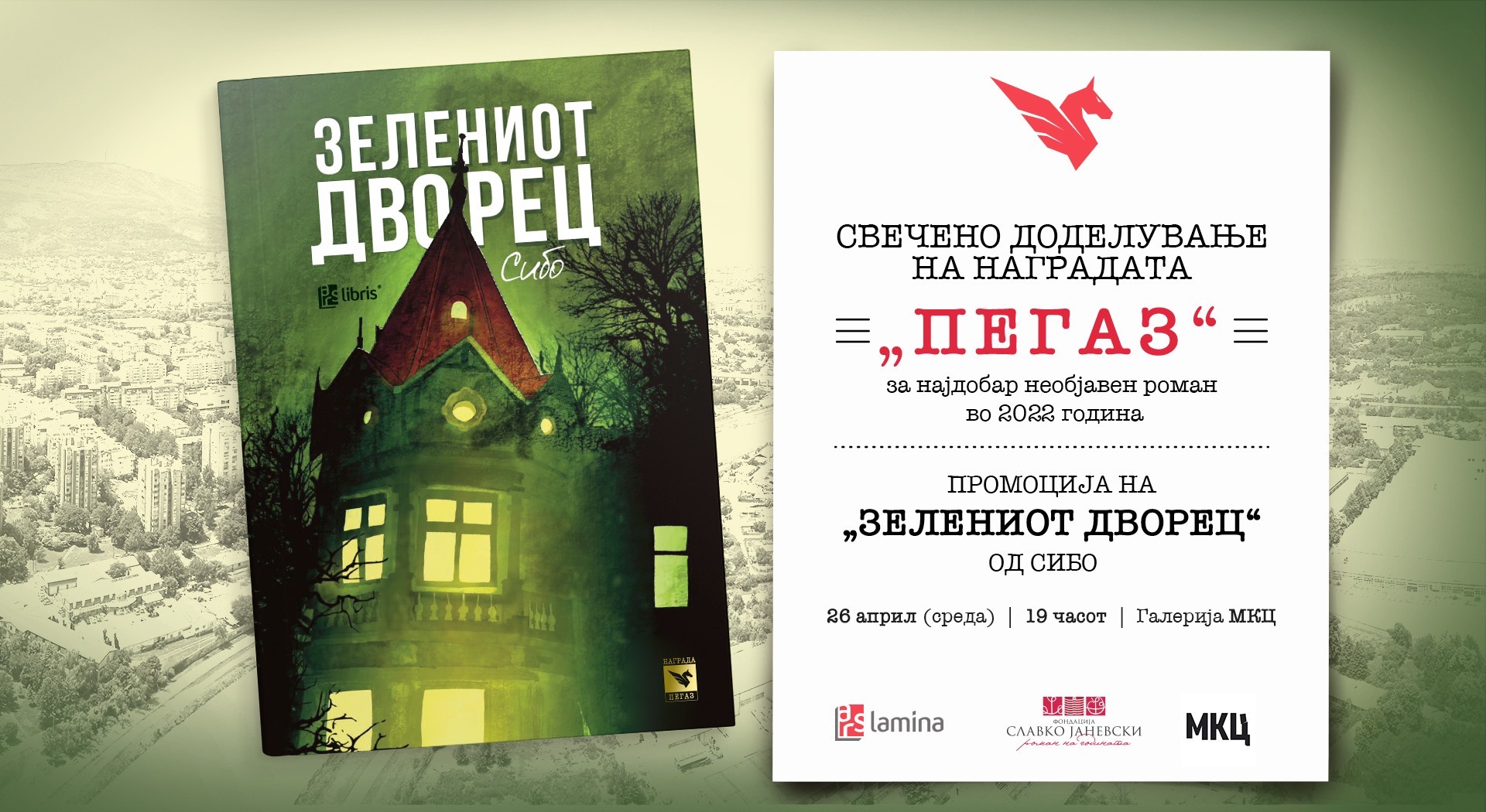 Свеченото доделување на наградата „Пегаз“ за 2022 година и промоцијата на победничкиот роман – „Зелениот дворец“ од авторот Сибо, ќе се одржат на 26 април (среда), со почеток во 19 часот, во Галеријата на Младинскиот културен центар во Скопје.
