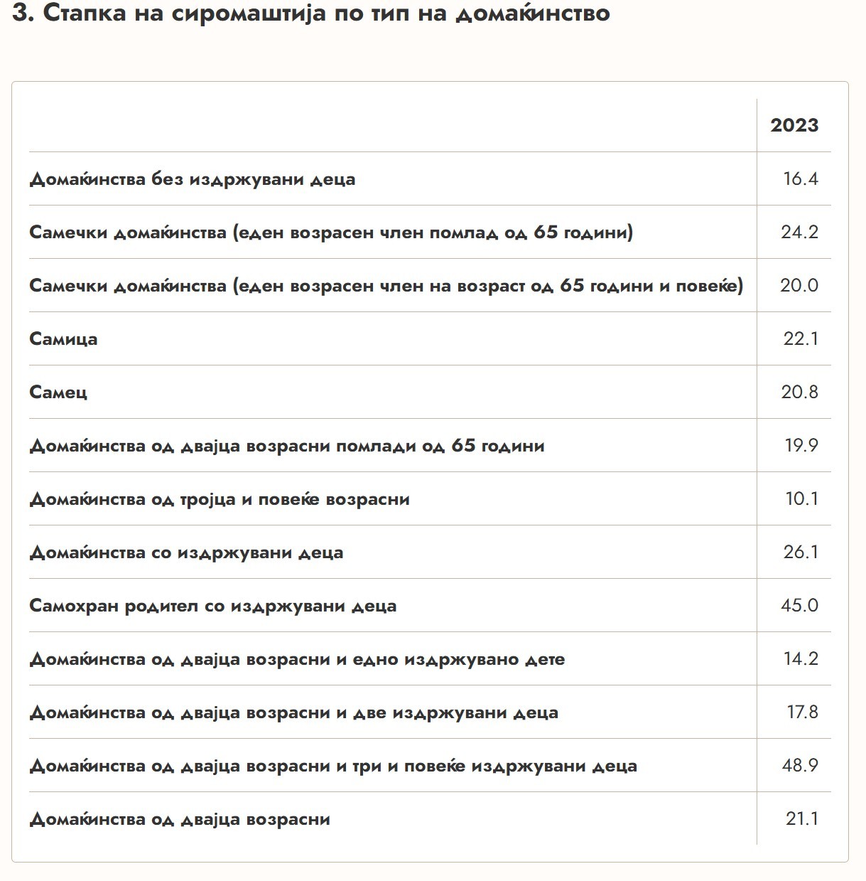 - Анализирано по типови домаќинства, стапката на сиромаштија на домаќинствата составени од двајца возрасни со две издржувани деца во 2023 година е 17,8 отсто.
