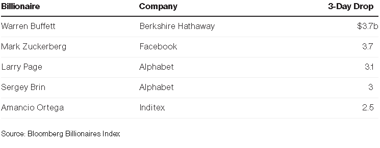 Најголемата сума пари оваа недела има загубено американскиот инвеститор Ворен Бафет. Шефот на „Berkshire Hathaway Inc.“ има 3,74 милијарди долари помалку, па неговото богатство сега изнесува 86,7 милијарди долари. Малку помалку од него загубил основачот на социјалната мрежа „Facebook“, Марк Цукерберг, кој од своја страна останал без 3,71 милијарди долари.