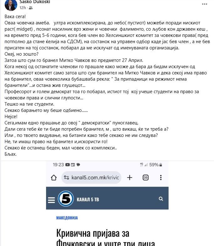 ДУКОВСКИ ГО НАРЕЧЕ ФРЧКОСКИ АМЕБА: „Бараше да ме исклучат од Хелсиншки затоа што сум го бранел Митко Чавков за 27 април“