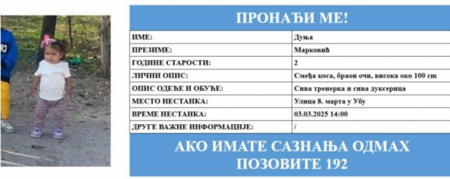 Дуња Марковиќ (2) исчезна вчера во Уб.