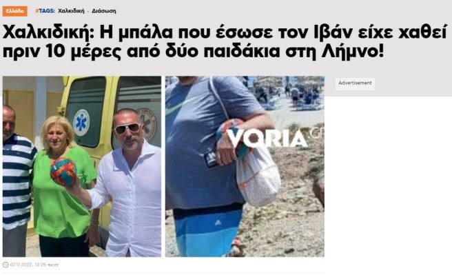 „Спасот“ во Одисеја на Иван пристигна од Лемнос. Причината за спасувањето на Иван на Халкидики, кој успеал да излезе неповреден по 19 часа авантура на море, благодарение на топката која случајно била пронајдена во водата. Топката што го спаси Иван на Халкидики била изгубена од плажата Евгати во Лемнос, на 30 јуни!, открива voria.gr.