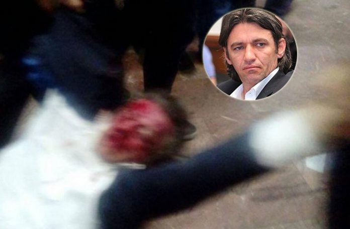 Додека пратеникот Зијадин Села лежи раскрвавен, без да покаже знаци на живот, еден од обвинетите се доближува до него и со еден силен удар со нога го згазнува врз глава.