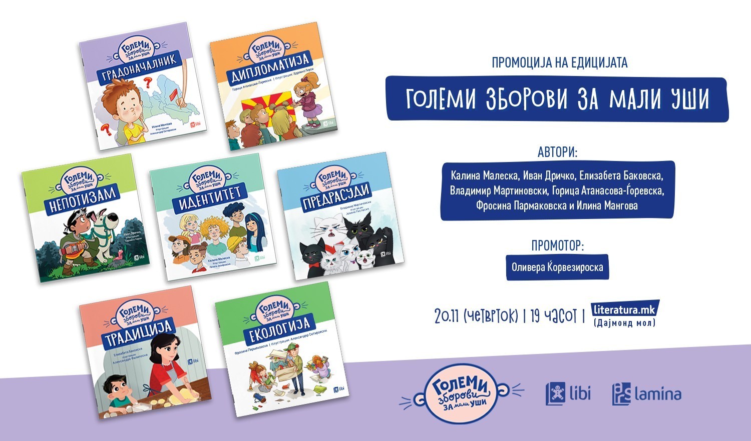 На Светскиот ден на детето, 20 ноември, во 19 часот, во книжарницата „Литература.мк“ во „Дајмонд мол“, ќе биде промовирана едицијата „Големи зборови за мали уши“, на издавачката куќа „Арс Ламина“. Промотор на едицијата ќе биде уредничката Оливера Ќорвезироска, а пред публиката ќе се обратат авторите на сликовниците.