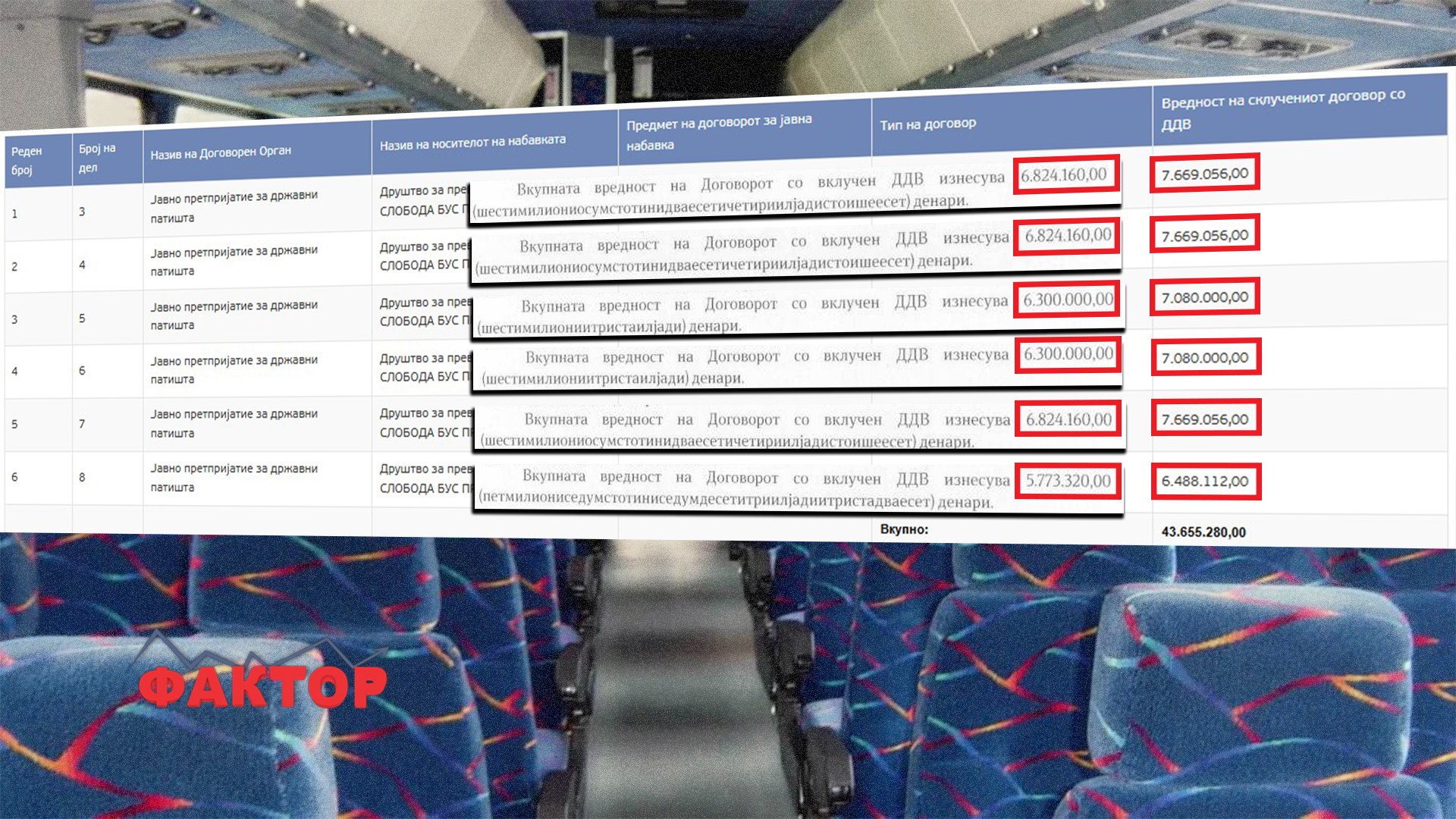 За правците Тетово до патарини Тетово-Желино-Глумово и обратно, како и за релацијата Куманово до патарини Романовце-Миладиновци-Петровец и обратно, на електронскиот систем е заведена сумата од по 7.669.056 денари со вклучен ДДВ. За истите правци, во договорите се наведени суми од по 6.300.000 со вклучен ДДВ.