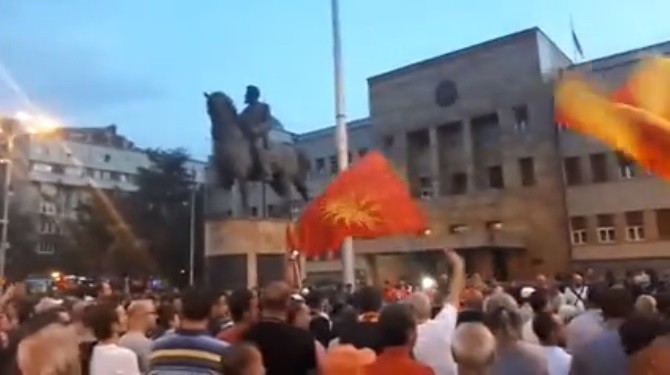 „Едно име имаме, во душата го носиме“ пее толпата народ пред Собранието која се собра вечерва за да го искаже својот револт против договорот со Грција кој предвидува промена на името во Република Северна Македонија.