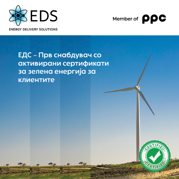 ЕДС – Прв снабдувач со активирани сертификати за зелена енергија за клиентите