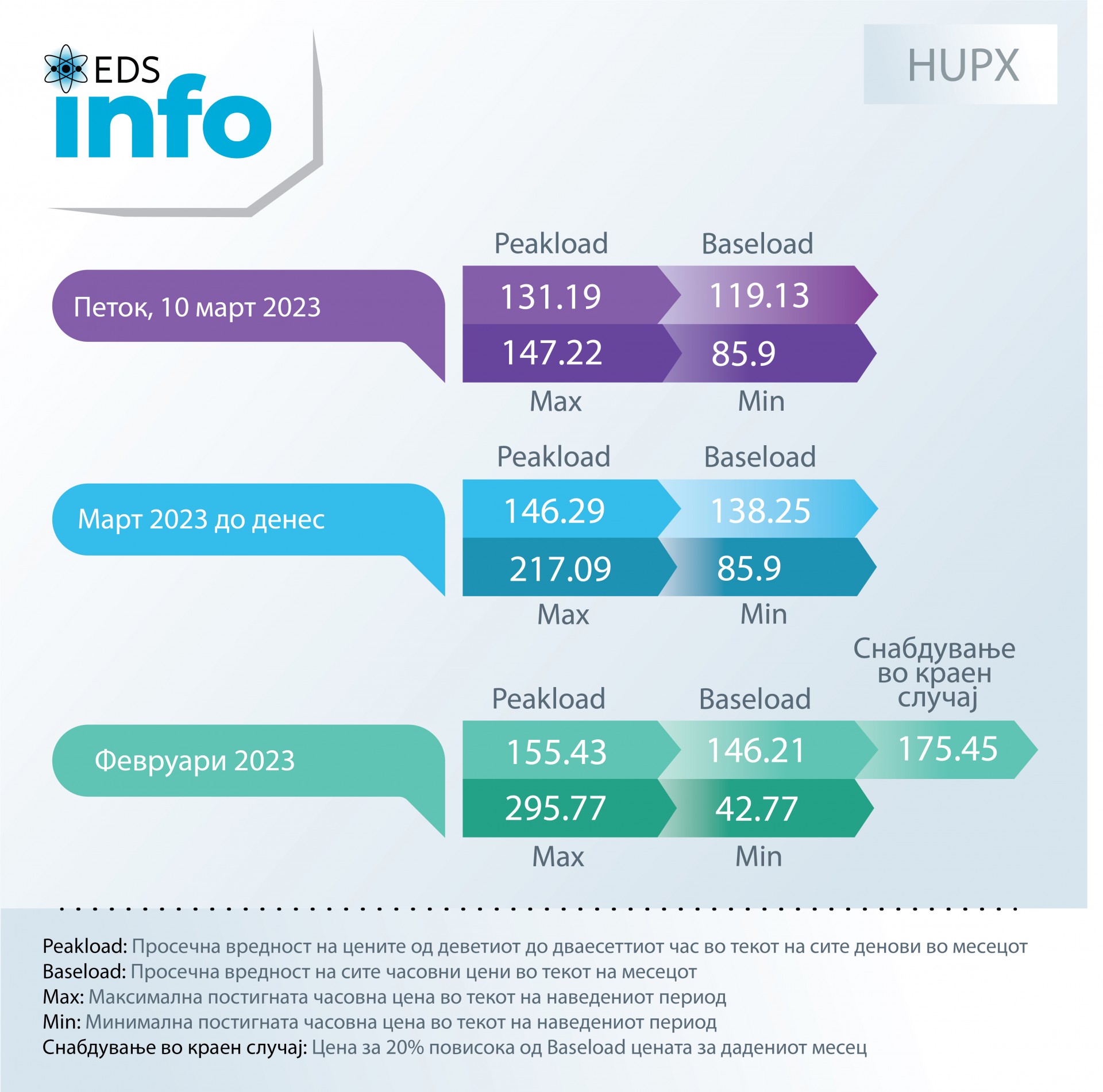 Согласно податоците за движењето на цените на берзата HUPX во Унгарија за10 март просечнатачасовна цена на еден мегават час електрична енергија (baseload) изнесува 119,13 евра/mwh.