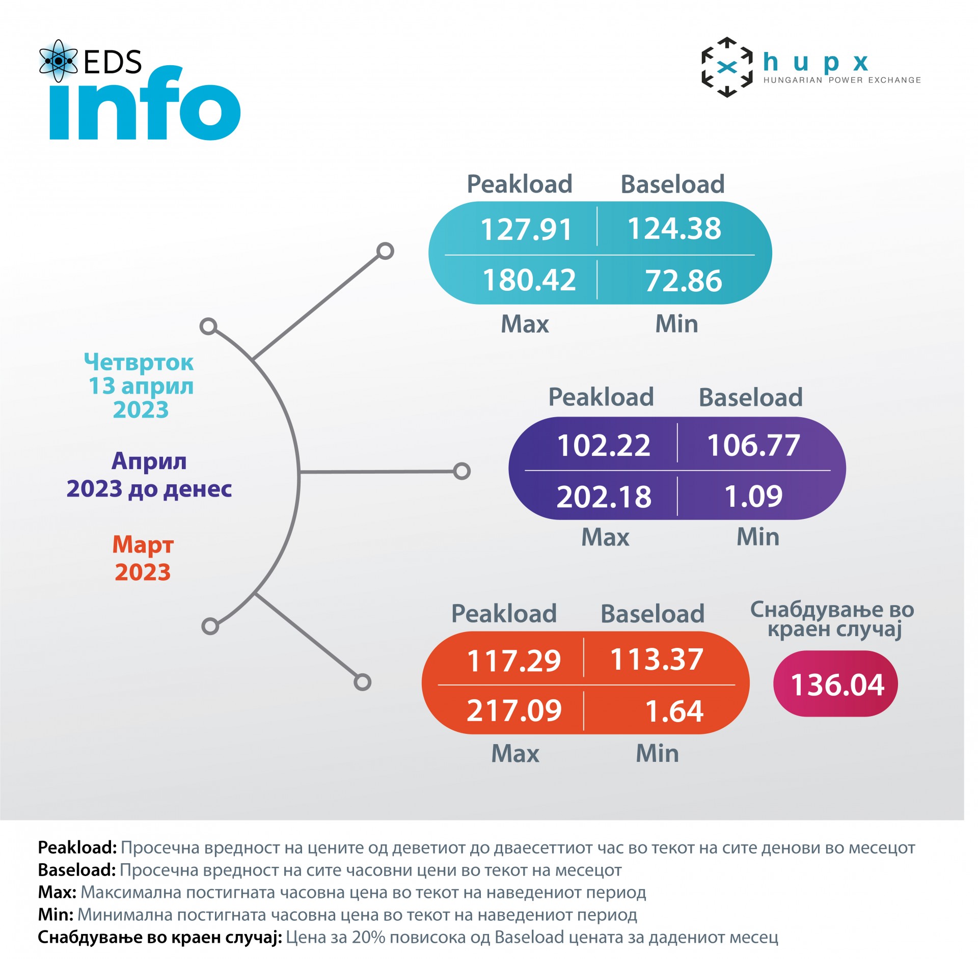 Согласно податоците за движењето на цените на берзата HUPX во Унгарија за 13 април просечнатачасовна цена на еден мегават час електрична енергија (baseload) изнесува 124,38 евра/mwh.