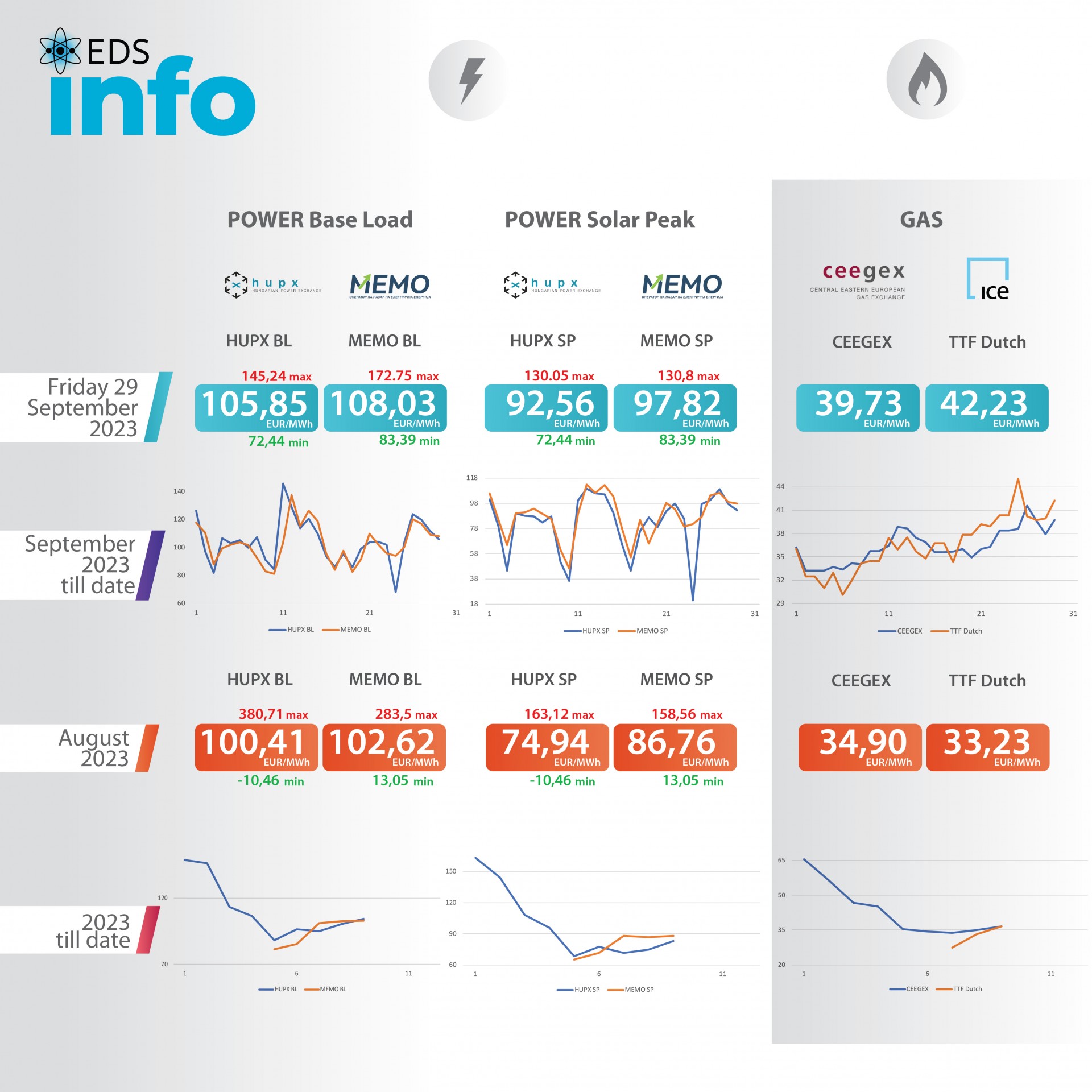 Согласно податоците за движењето на цените на берзата HUPX во Унгарија за29 септемврисептември просечнатачасовна цена на еден мегават час електрична енергија (baseload) изнесува 105,85евра/mwh, додека на Македонската берза за електрична енергија цената е 108,03 евра/mwh